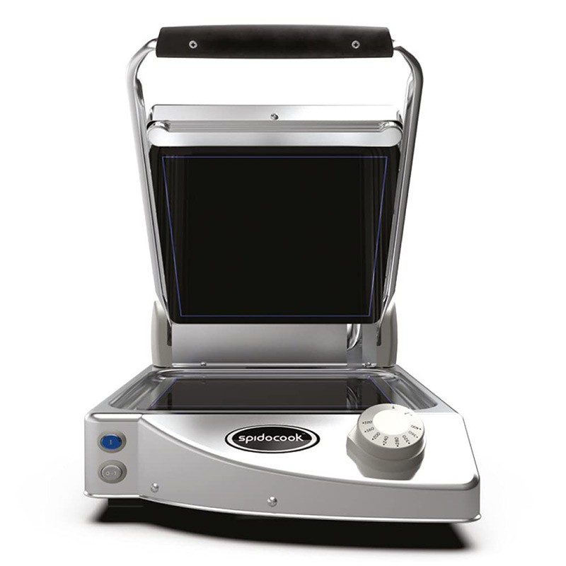 Grill professionnel manuel SPIDOCOOK avec surface en vitrocéramique lisse noire (250x250 mm). Design compact et robuste pour une cuisson saine et uniforme, parfait pour les comptoirs et petites cuisines professionnelles.